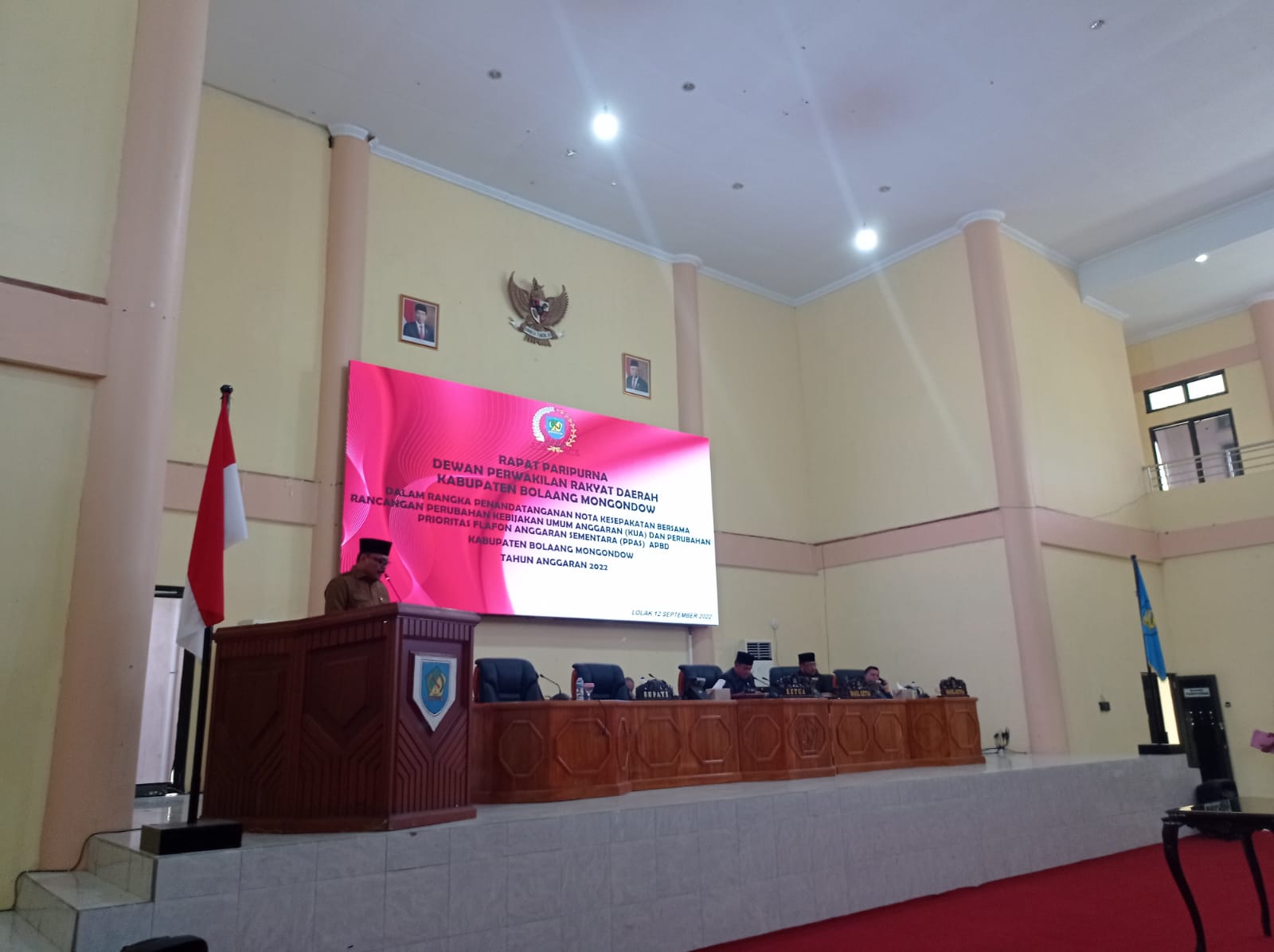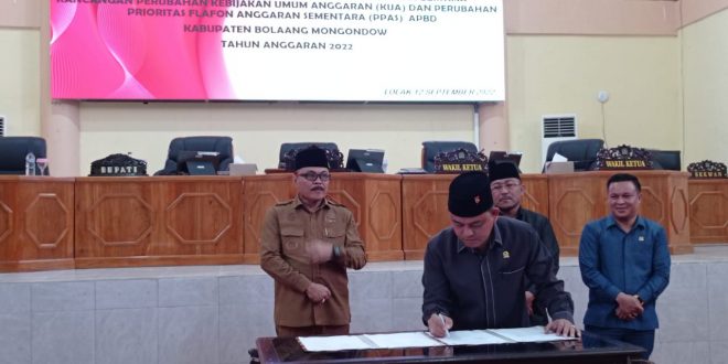 KORDINAT.ID – Dewan Perwakilan Rakyat Daerah (DPRD) Kabupaten Bolaang Mongondow (Bolmong) menggelar Rapat Paripurna Penandatanganan Nota Kesepakatan Bersama Rancangan Perubahan Kebijakan Umum Anggaran (KUA) dan Perubahan Prioritas Plafon Anggaran Sementara (PPAS) APBD Bolmong Tahun Anggaran (T.A) 2022, Lolak 12 September 2022.